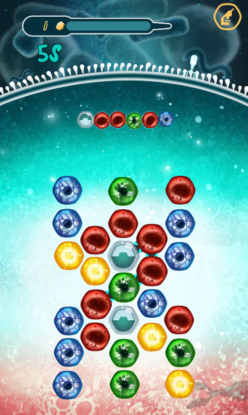 Defend your bacteria against waves of attacking viruses, by matching their DNA sequences. CRISPR Crunch is a free-to-play mobile game that immerses you in the wondrous world of microbiology. The gameplay combines familiar tile-matching mechanics with an innovative scientific setting and story.